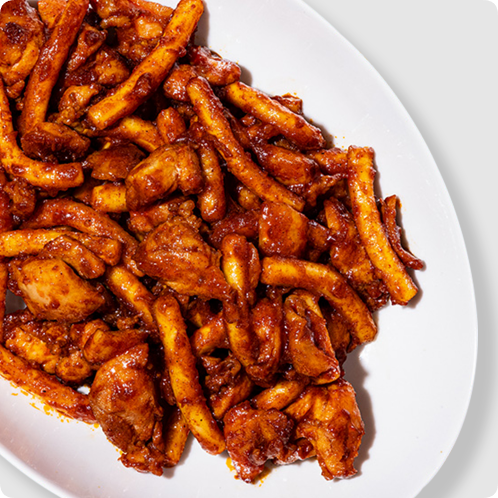 A. 닭고기만 550g에 떡까지 포함되어 성인 2인이 충분히 배불리 드실 수 있는 넉넉한 양입니다. 사리를 추가하면 3인까지도 가능해요.